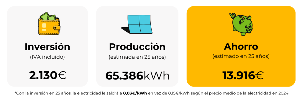 Actualmente, el coste medio del kWh, con impuestos incluidos, es de unos 0,15€. Al unirte a la Comunidad Energética tendrás producción propia durante los 25 años de vida útil, lo que equivale a que el kWh te saliera a 0,033€ . Es imposible encontrar una opción más barata.