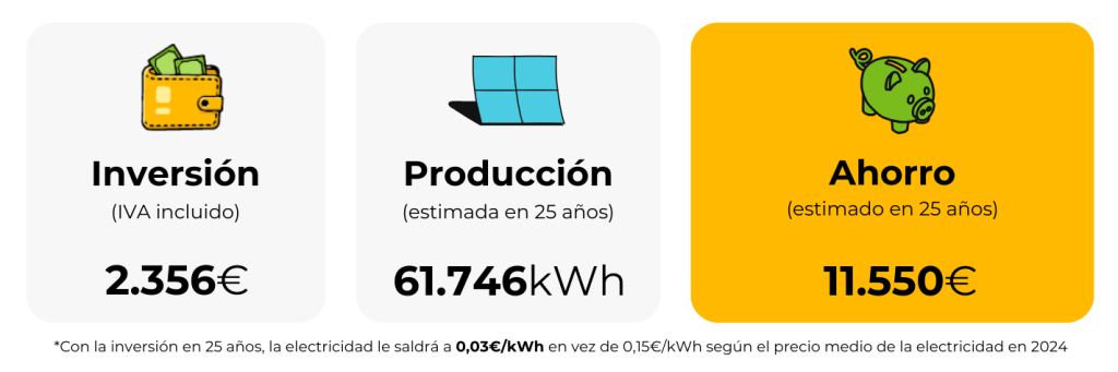 Actualmente, el coste medio del kWh, con impuestos incluidos, es de unos 0,15€. Al unirte a la Comunidad Energética tendrás producción propia durante los 25 años de vida útil, lo que equivale a que el kWh te saliera a 0,039€ . Es imposible encontrar una opción más barata.